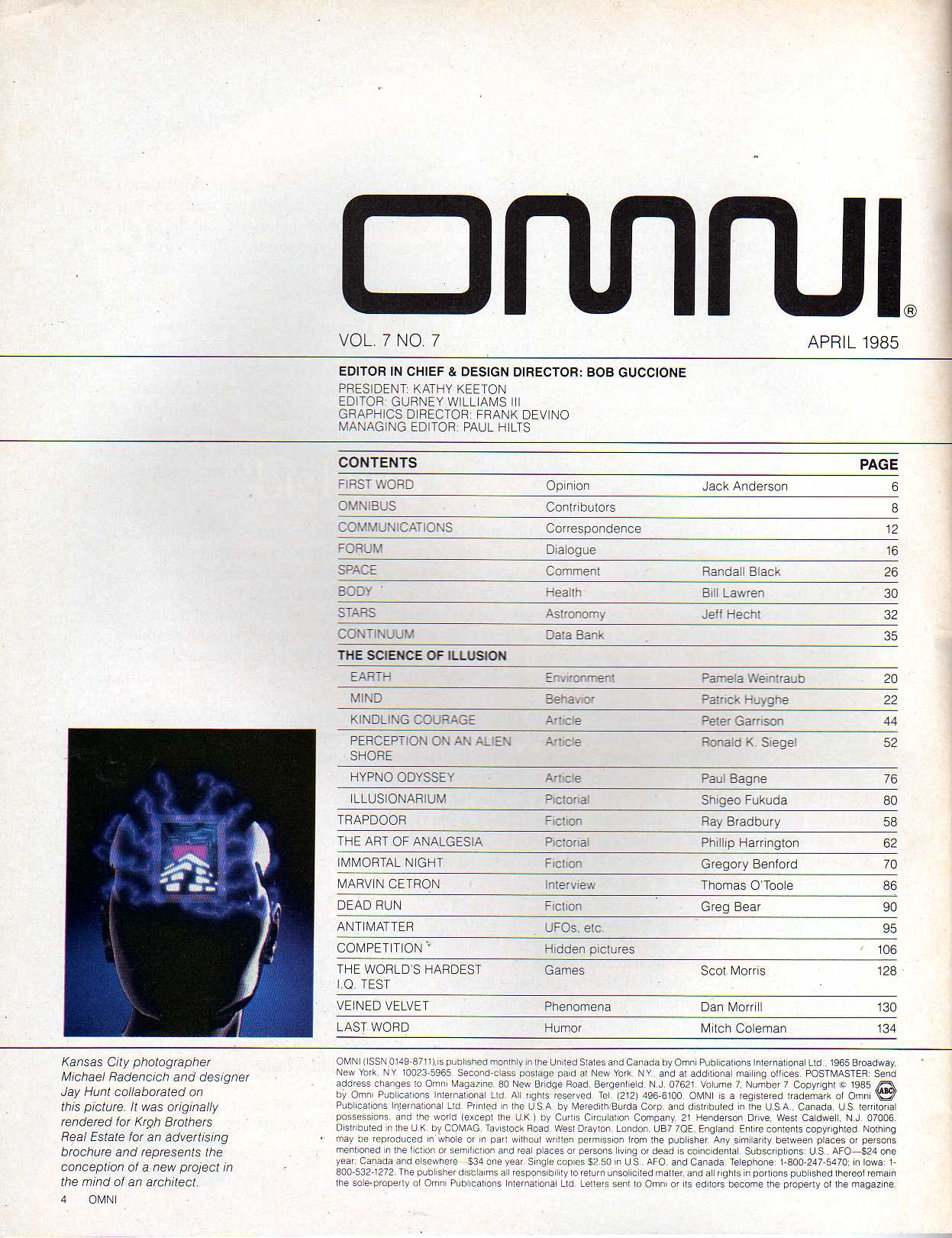 Ray Bradbury Trapdoor. Gregory Benford Immortal Night. Greg Bear Dead Run. Scot Morris World's Hardest IQ Test. Index by Author Index by Topics Omni Cartoons Memorable Omni Ads Main Index